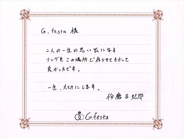 三重県鳥羽市 Rさん・Hさん (三重店/結婚指輪・ワックス) ▲ 感想を読む DATA コース 結婚指輪(ワックス) デザイン コンビネーション 店舗 三重店 制作時間 2時間 素材 Pt900 K18PG/Pt900 K18YG リング幅 2.4mm/2.7mm オプション 表面:ダイヤモンドセッティング 内面:誕生石セッティング
