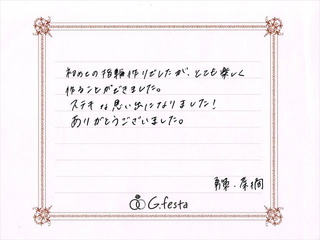 三重県伊勢市 Yさん・Nさん (三重店/結婚指輪・ワックス) ▲ 感想を読む DATA コース 結婚指輪(ワックス) デザイン クロス 店舗 三重店 制作時間 2時間 素材 Pt900/Pt900 リング幅 3.0mm/3.0mm オプション 表面:ダイヤモンドセッティング