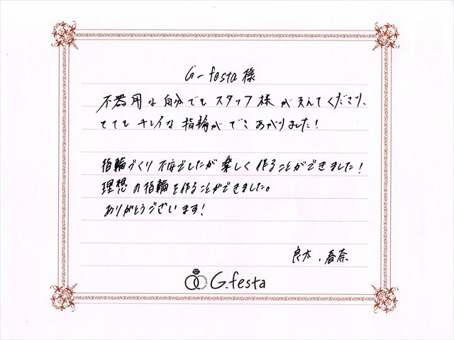 三重県津市 Rさん・Hさん (三重店/結婚指輪・ワックス) ▲ 感想を読む DATA コース 結婚指輪(ワックス) デザイン ウェーブ 店舗 三重店 制作時間 2時間 素材 Pt900/Pt900 リング幅 2.6mm/3.0mm オプション 表面:ダイヤモンドセッティング 内面:誕生石セッティング