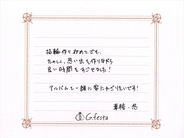 愛知県知多郡 Aさん・Hさん (名古屋店/結婚指輪・ワックス) ▲ 感想を読む DATA コース 結婚指輪(ワックス) デザイン ストレートコンビネーション 店舗 名古屋店 制作時間 1時間半 素材 Pt900 K18PG/Pt900 K18YG リング幅 2.5mm/2.5mm オプション 表面:ダイヤモンドセッティング 内面:誕生石セッティング