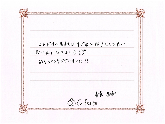 三重県津市 Yさん・Kさん (三重店/結婚指輪・ワックス) ▲ 感想を読む DATA コース 結婚指輪(ワックス) デザイン ウェーブ 店舗 三重店 制作時間 2時間 素材 Pt900/Pt900 リング幅 2.3mm/2.3mm オプション 表面:ダイヤモンドセッティング
