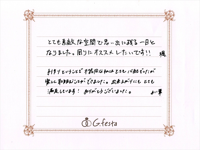 愛知県みよし市 Hさん・Mさん (岡崎店/結婚指輪・ワックス) ▲ 感想を読む DATA コース 結婚指輪(ワックス) デザイン ストレートクロス 店舗 岡崎店 制作時間 2時間 素材 PT900/PT900 リング幅 2.5mm/2.5mm オプション 表面:ダイヤモンドセッティング