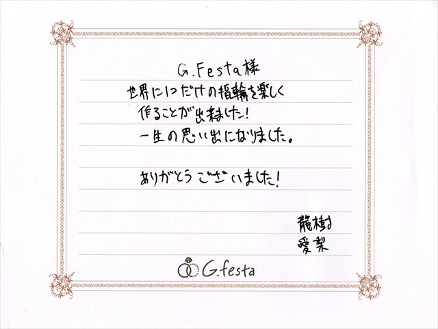 愛知県名古屋市 Tさん・Aさん (名古屋店/結婚指輪・ワックス) ▲ 感想を読む DATA コース 結婚指輪(ワックス) デザイン ストレートコンビネーション 店舗 名古屋店 制作時間 2時間 素材 Pt900 K18YG/Pt900 K18YG リング幅 2.5mm/3.4mm オプション 表面:ダイヤモンドセッティング