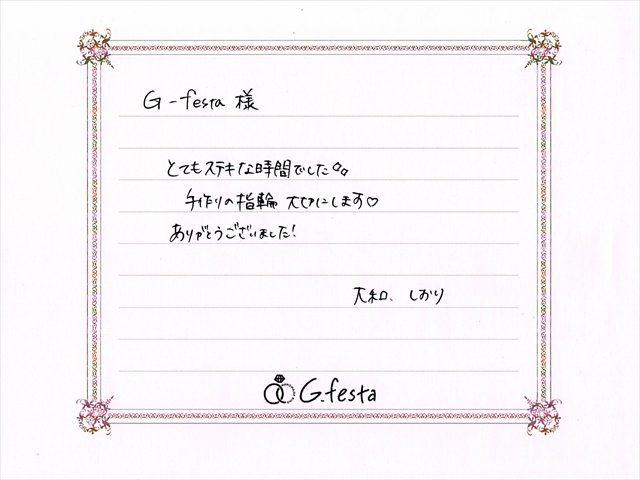 愛知県名古屋市 Yさん・Sさん (岐阜本店/結婚指輪・ワックス) ▲ 感想を読む DATA コース 結婚指輪(ワックス) デザイン クロス 店舗 岐阜本店 制作時間 2時間半 素材 Pt900/Pt900 リング幅 2.5mm/3.5mm オプション 表面:ダイヤモンドセッティング 内面:誕生石セッティング