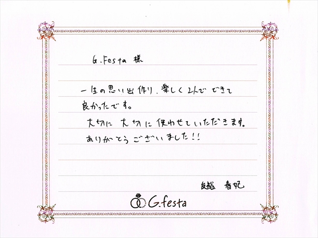 岐阜県岐阜市 Tさん・Hさん (岐阜本店/結婚指輪・ワックス) ▲ 感想を読む DATA コース 結婚指輪(ワックス) デザイン ストレート 店舗 岐阜本店 制作時間 1時間半 素材 Pt900/Pt900 リング幅 2.0mm/2.5mm オプション 表面:ダイヤモンドセッティング 内面:誕生石セッティング