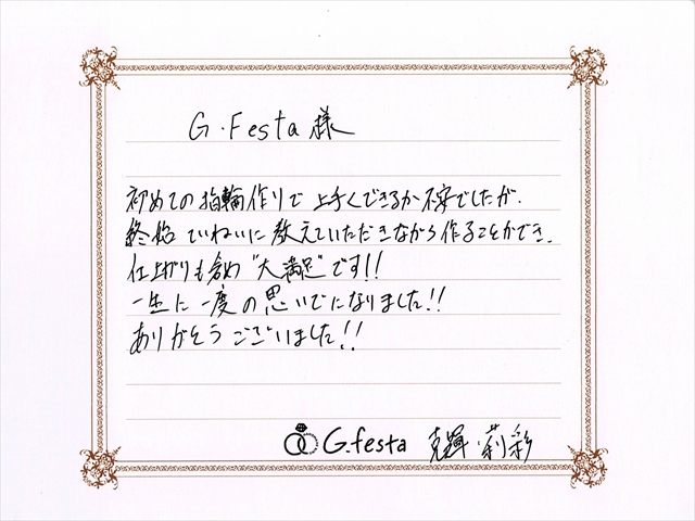 愛知県一宮市 Kさん・Rさん (岐阜本店/結婚指輪・ワックス) ▲ 感想を読む DATA コース 結婚指輪(ワックス) デザイン ストレートウェーブ 店舗 岐阜本店 制作時間 2時間 素材 Pt900/Pt900 リング幅 2.5mm/3.0mm オプション 表面:ダイヤモンドセッティング 内面:誕生石セッティング