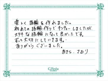愛知県一宮市 Aさん・Sさん (名古屋店/結婚指輪・ワックス) ▲ 感想を読む DATA コース 結婚指輪(ワックス) デザイン ストレート 店舗 名古屋店 制作時間 2時間 素材 プラチナ リング幅 2mm/2.5mm オプション 表面:ダイヤモンドセッティング 内面:誕生石セッティング