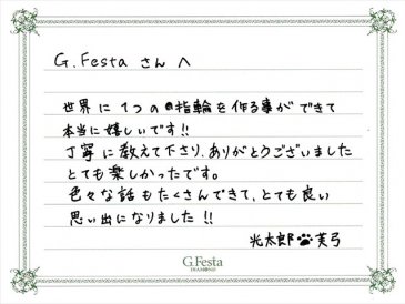 愛知県あま市 Kさん・Fさん (名古屋店/結婚指輪・ワックス) ▲ 感想を読む DATA コース 結婚指輪(ワックス) デザイン V字 店舗 名古屋店 制作時間 3時間 素材 プラチナ オプション 表面:ダイヤモンドセッティング 内面:誕生石セッティング