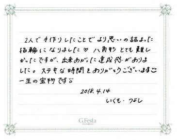 愛知県春日井市 Tさん・Iさん (名古屋店/結婚指輪・ワックス) ▲ 感想を読む DATA コース 結婚指輪(ワックス) デザイン 多面体 店舗 名古屋店 制作時間 2時間半 素材 プラチナ リング幅 2.8mm オプション 表面:ダイヤモンドセッティング