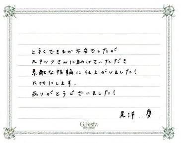静岡県浜松市 Aさん・Aさん (浜松店/結婚指輪・ワックス) ▲ 感想を読む DATA コース 結婚指輪(ワックス) デザイン クロス 店舗 浜松店 制作時間 2時間 素材 プラチナ/K18YG オプション 表面:ダイヤモンドセッティング 内面:誕生石セッティング