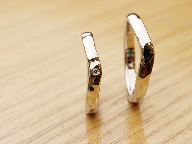 愛知県高浜市 Aさん・Jさん (名古屋店/結婚指輪・ワックス) ▲ 感想を読む DATA コース 結婚指輪(ワックス) デザイン つち目 店舗 名古屋店 制作時間 2時間 素材 プラチナ リング幅 2.5mm/2.7mm オプション 表面:ダイヤモンドセッティング 内面:誕生石セッティング