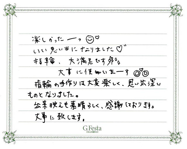 三重県桑名市 Yさん・Mさん (三重店/結婚指輪・ワックス) ▲ 感想を読む DATA コース 結婚指輪(ワックス) デザイン ストレート 店舗 三重店 制作時間 1時間 素材 K18YG リング幅 2.3mm/3mm オプション 表面:ダイヤモンドセッティング